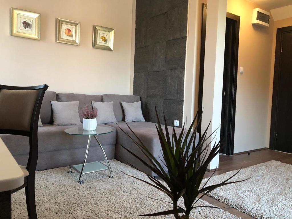 Soba sa bračnim krevetom tipa “King size bed”, dodatnim dnevnim boravkom sa kaučem na rasklapanje za još 2 osobe. Radni sto, kuvalo, frižider, sef, orman, TV, terasa i zasebno kupatilo sa tuš kabinom.
